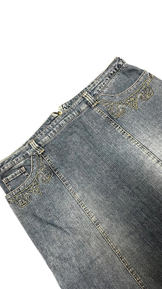 L - Gasoline 90s Flower Embroidered Denim Maxi Skirt