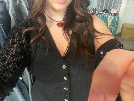 M - Y2K Rhinestone Graphic 1/4 Button Ribbed Top