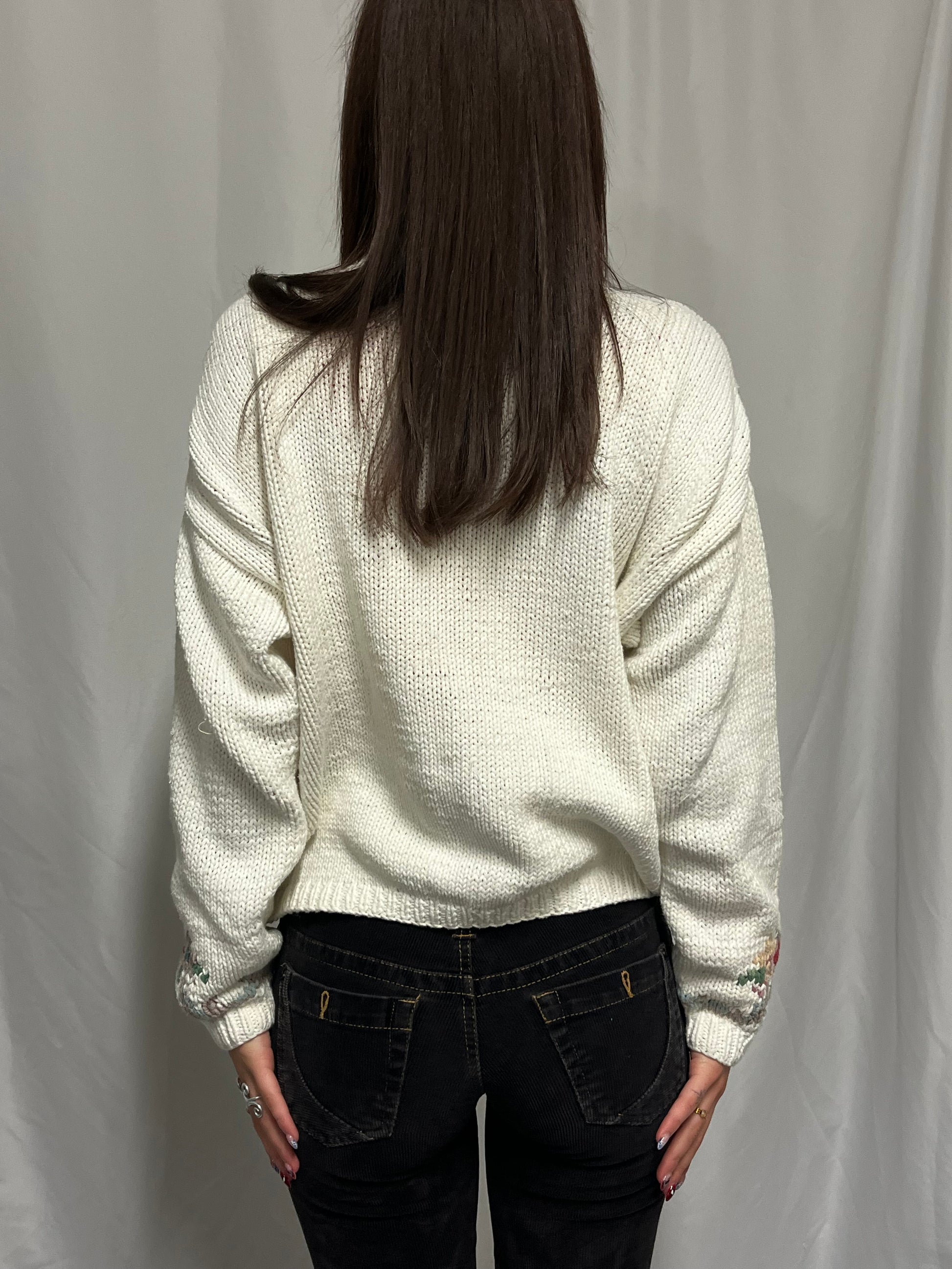 White 100% cotton with floral design. In great vintage condition, just a few spots where the thread is a little loose. Button up neck.