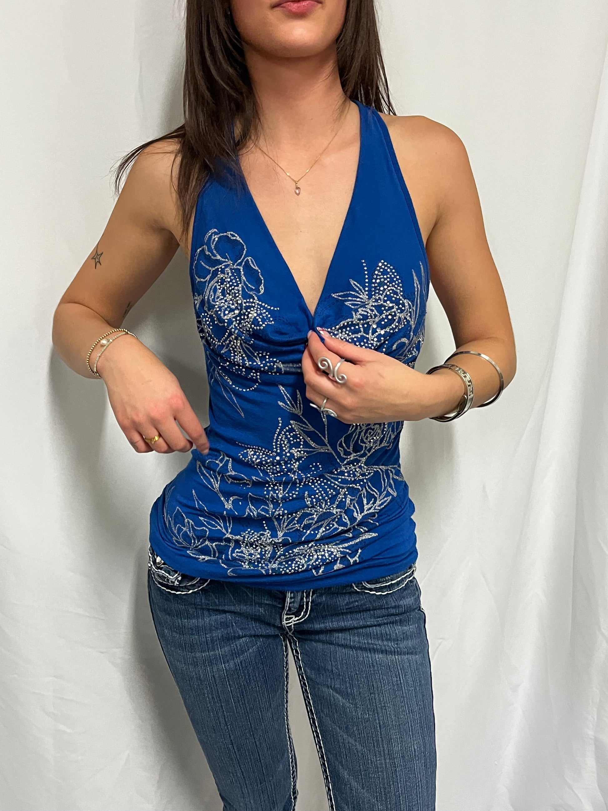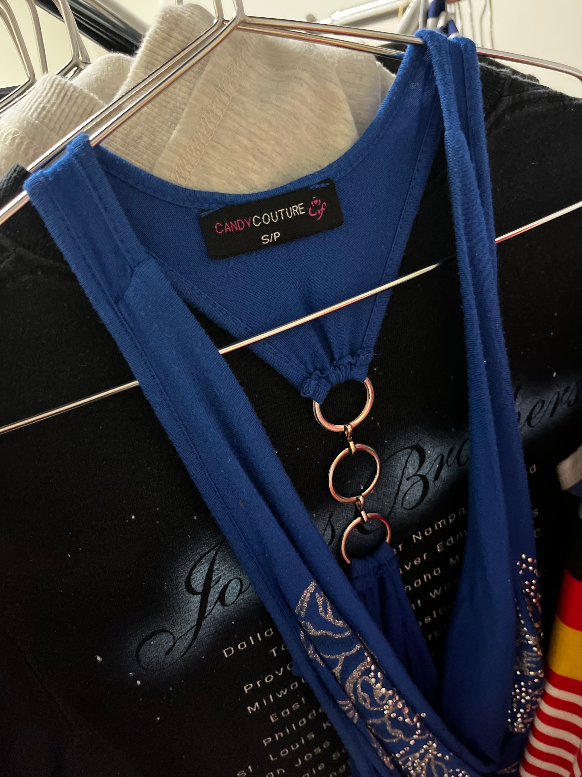 S - Candy Couture Y2K Cowl Neck Silver Rings Top