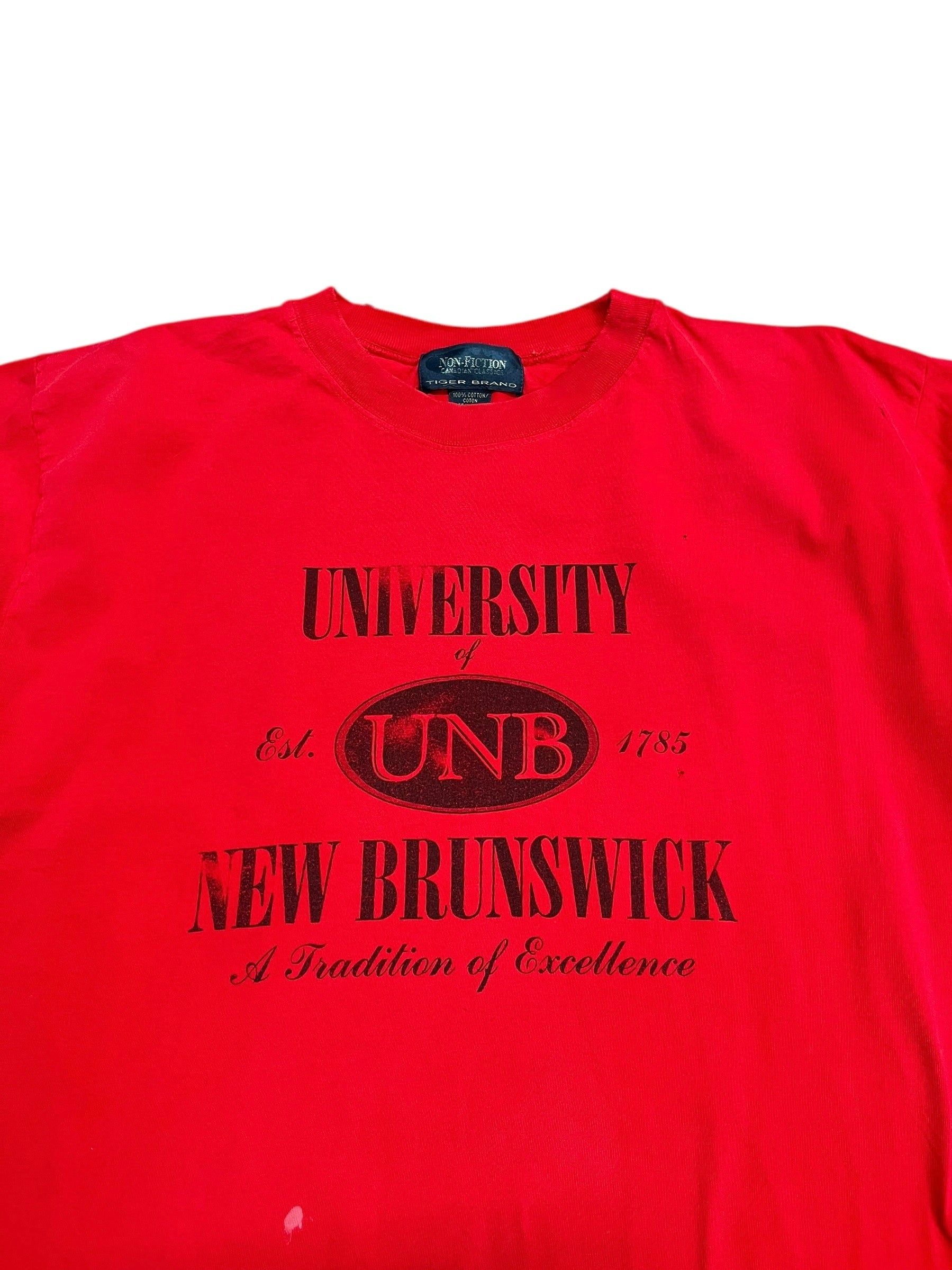 University of New Brunswick on Non-Fiction tee. 90s goodness, flawed but adds character.