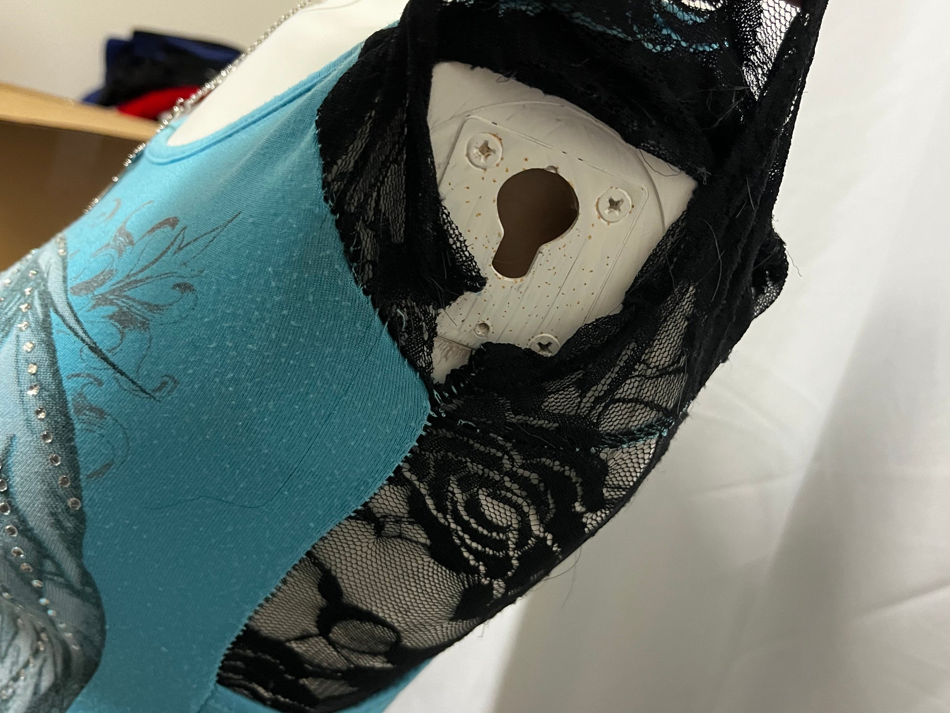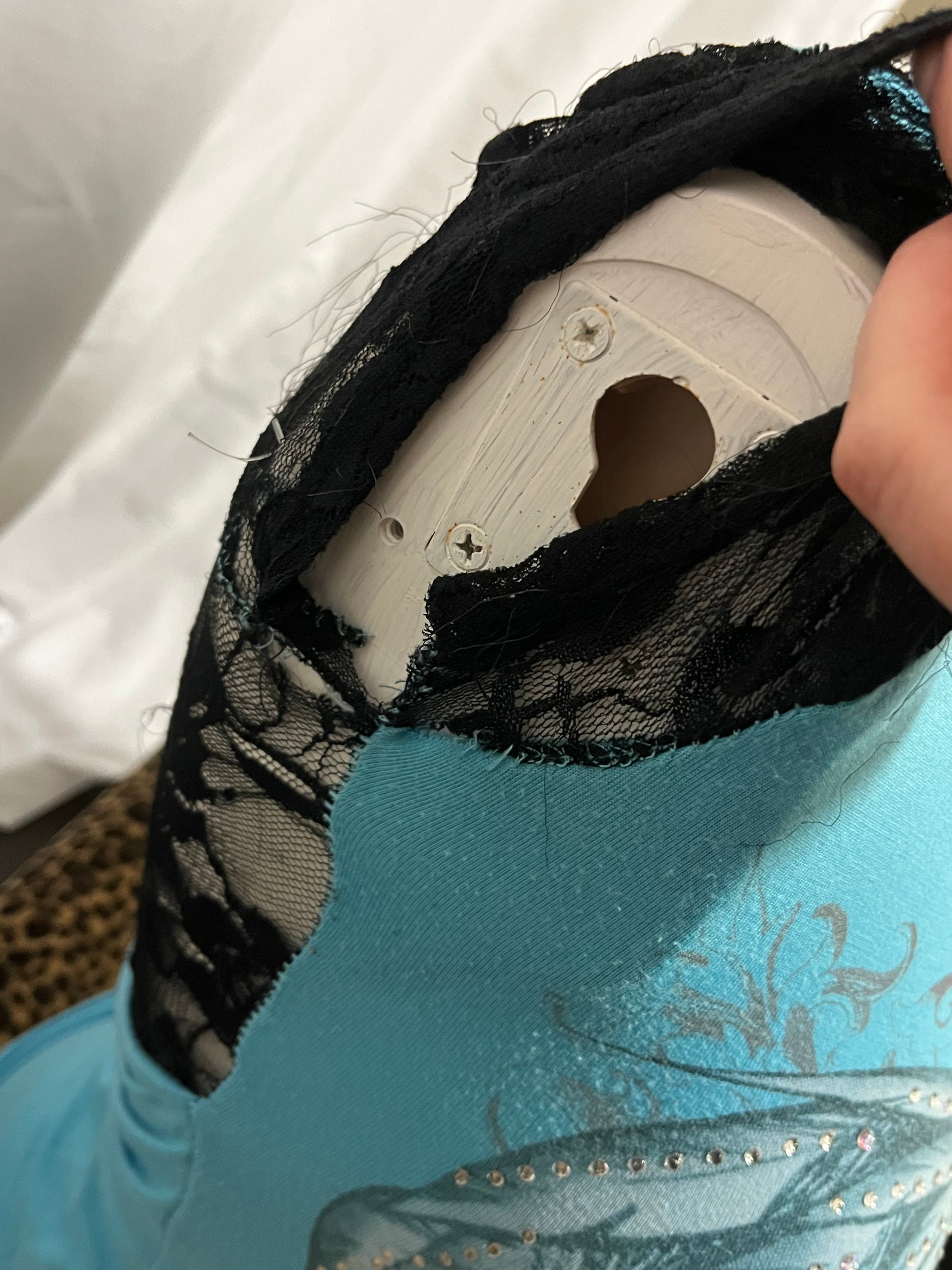 Black lace detailing, ring on back, rhinestones in the wings. Cinched sides, very flattering. Some flaws - no staining but there was some attempted stitching and removal by previous owner (stitches pictured), and the lace is fraying in some spots. Reflected in price. - taken down from $32.